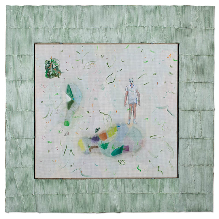 Herr Tennis as a cat, 2022, 85x90cm, oil en encaustic on squared canvas, frame, 130 x 130cm, diy-watercolours made out of flowers (violet crocus)