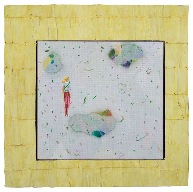 Frau Tennis, 2022, 85x90cm, oil en encaustic on squared canvas, frame, 130 x 130cm, diy-watercolours made out of flowers (daffodils)