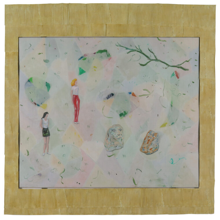 Talking Stones, 2025, 100x120cm,oil en encaustic on squared canvas, frame, 135x135cm, diy-watercolours made out of flowers (daffodils and white roses)