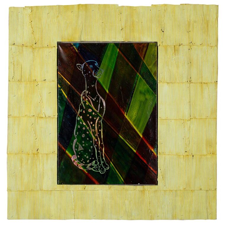 Leo, 2014, 60x45cm, oil en encaustic on squared canvas, frame, 100x100cm, diy-watercolours made out of flowers (white roses, sunflowers)